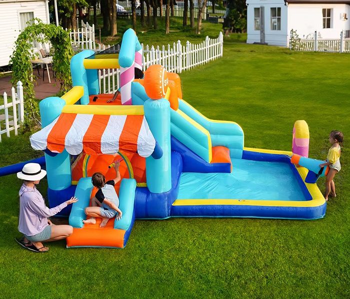 *) מתקן מתנפח, בעיצוב מתוק של חנות גלידות, בשילוב מים הכולל: מתקן קפיצות, מגלשה גבוהה, מגלשה נמוכה עם צילון,