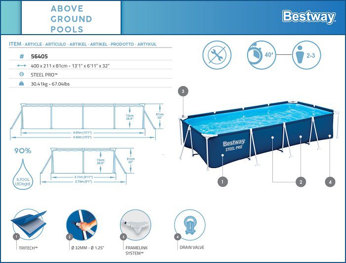 ערכת הכל כלול קלאסיק בריכת BESTWAY עמודים מלבנית 81*211*400 דגם 56405C