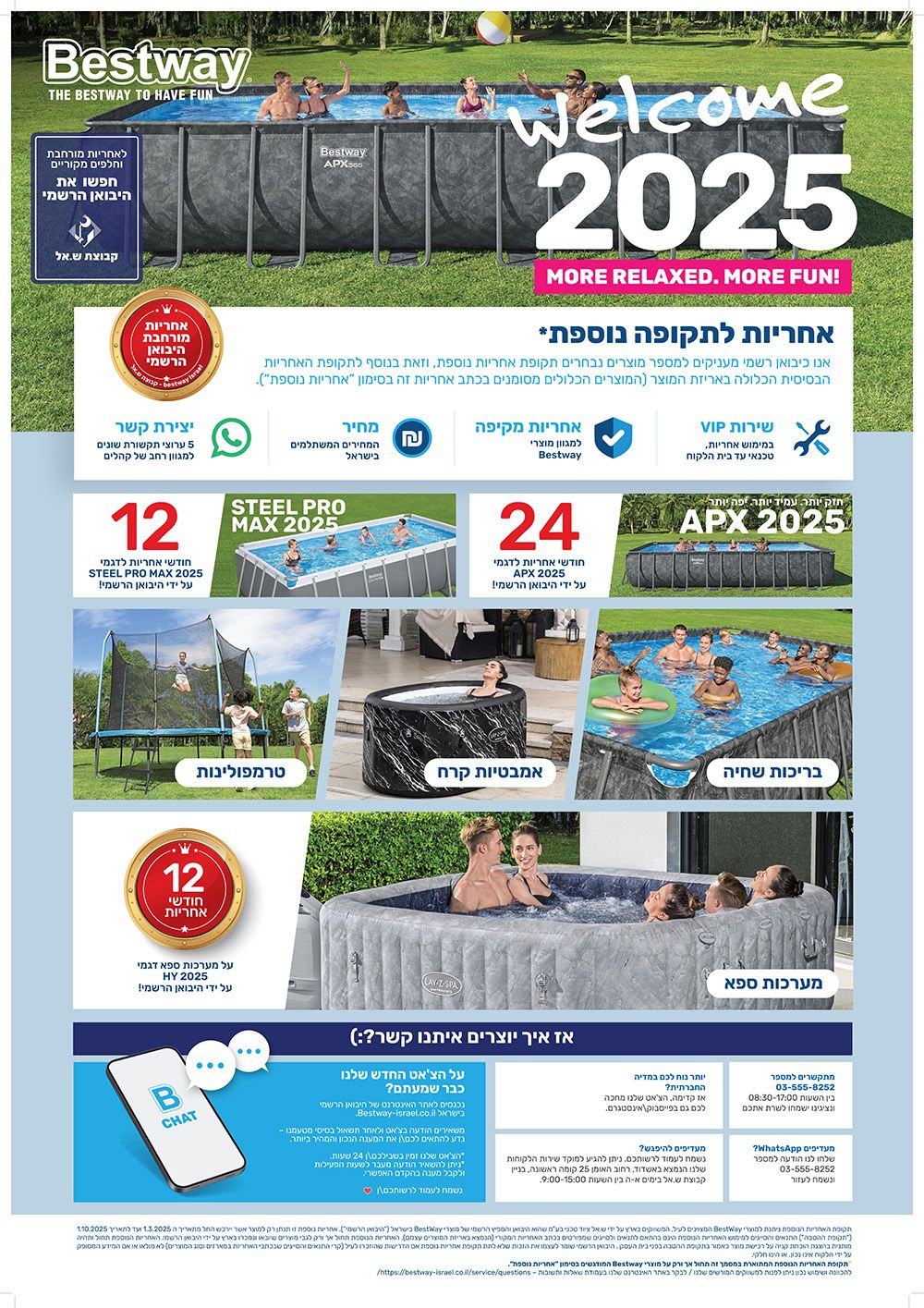 האחריות תינתן על ידי היבואן, טל: 03-5558252 , 03-5566363 או באתר www.bestway-israel.co.il
