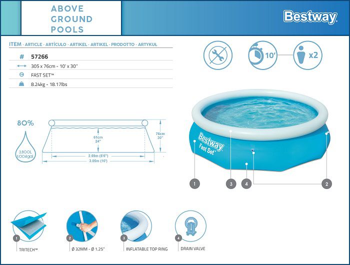 ערכת הכל כלול פרימיום בריכת הקמה מהירה (בריכת שפה מתנפחת) BESTWAY קוטר 305 עומק 76 דגם 57266P